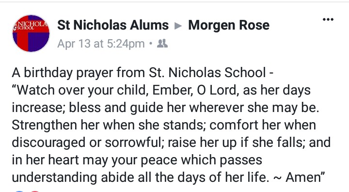 When I was in elementary school at St Nicholas, they would have us come up to the front of the church on the morning of our birthday and have a birthday prayer for each of us. On the day after she was born, a St Nicholas alum posted this same prayer on my Facebook page for her.