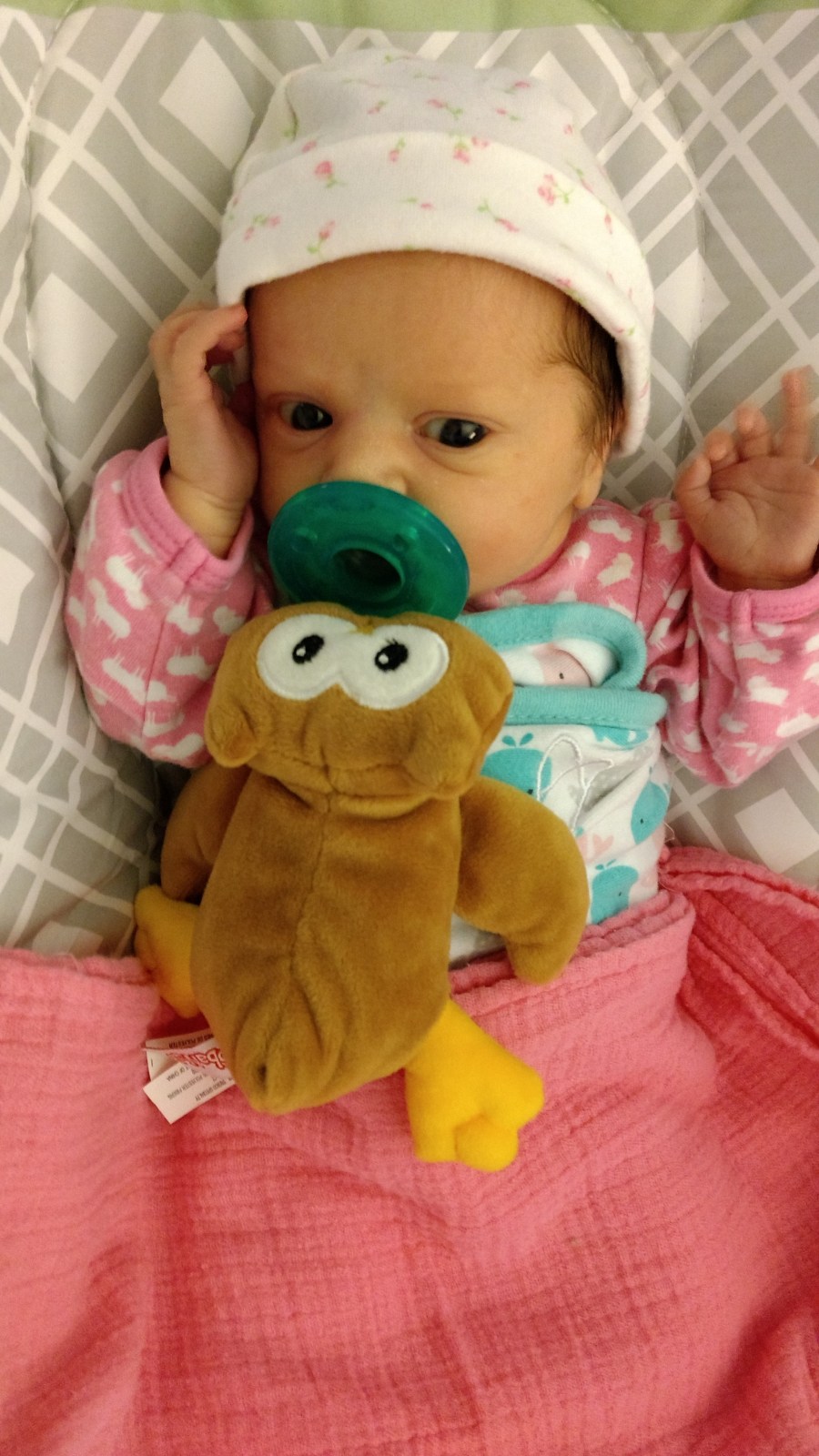 This little girl gets bigger every day. When she came home a week ago yesterday, she was barely eating 30ml of formula. Now she’s chowing down on 60ml every 3 hours if not more frequently.