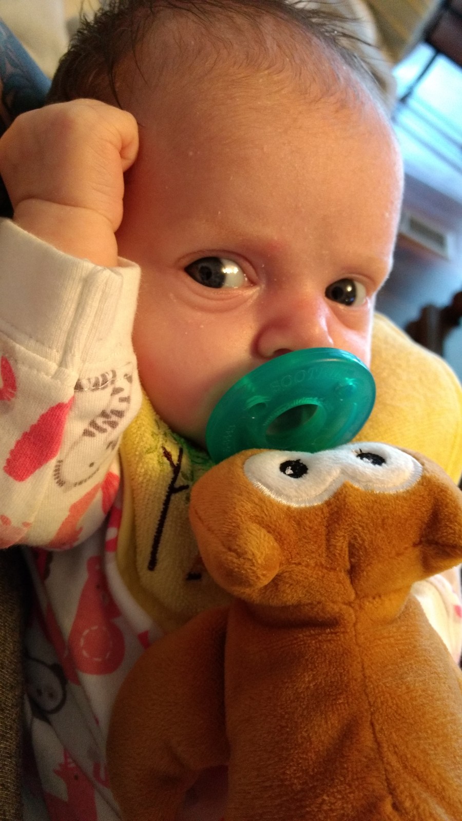 Ember and I are moving right along. She gets bigger every day, things change quickly. Things that “fixed” her upset the day before no longer work the next day and a whole new adventure starts. I find myself theorizing on Why Baby Does Things and What To Do on a daily basis, to the likely bore of everyone within earshot. Overall, we’re doing great. She is almost exclusively breastmilk fed (I use some of my rolling frozen inventory when she gets ahead of me – like on days she eats every 2 hours), but I’m not opposed to helping supplement with formula as needed. I’m taking her daily “leftovers” and freezing them for later and hoping to keep the current situation going for at least her first six months, maybe the first year. She’s happy and growing and I’m having so much fun being at home with her. Her pediatrician Dr Katie just had her third child, so congratulations are in order for her and we’ll be seeing a different doctor in the practice while she’s on leave – the doctor who originally checked Ember out in the hospital.