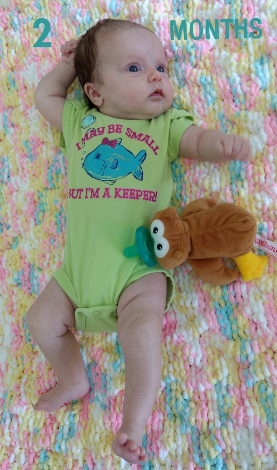 She’s over 9lbs and I’ve officially put away her Newborn clothes. She’s alert and really enjoys her play mat and is working hard on her tummy time.