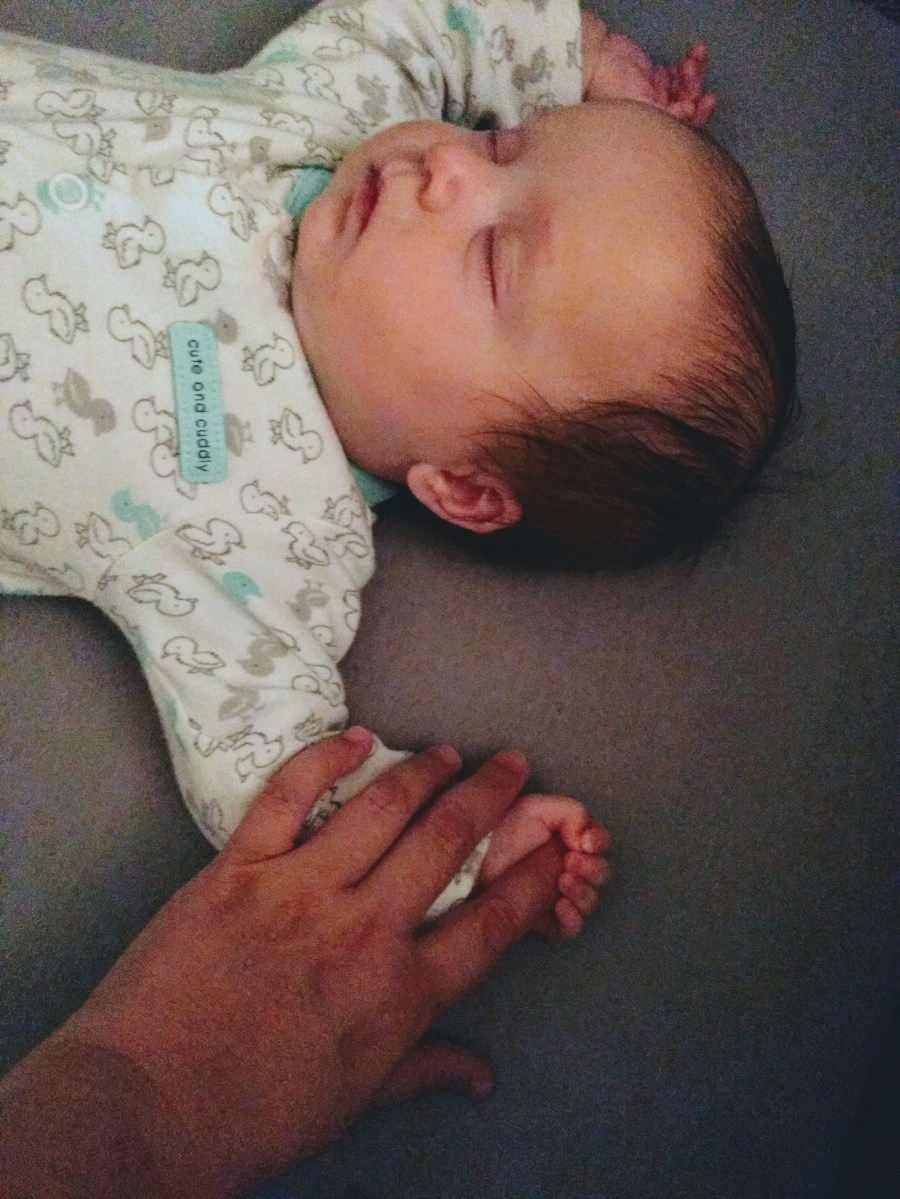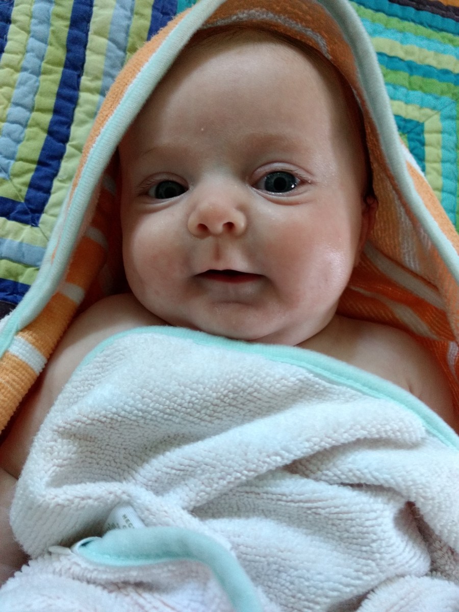 She has discovered her hands and spends most of her time making the loudest noises I’ve ever heard sucking on her tiny hands. She’s a big fan of bath time too.
