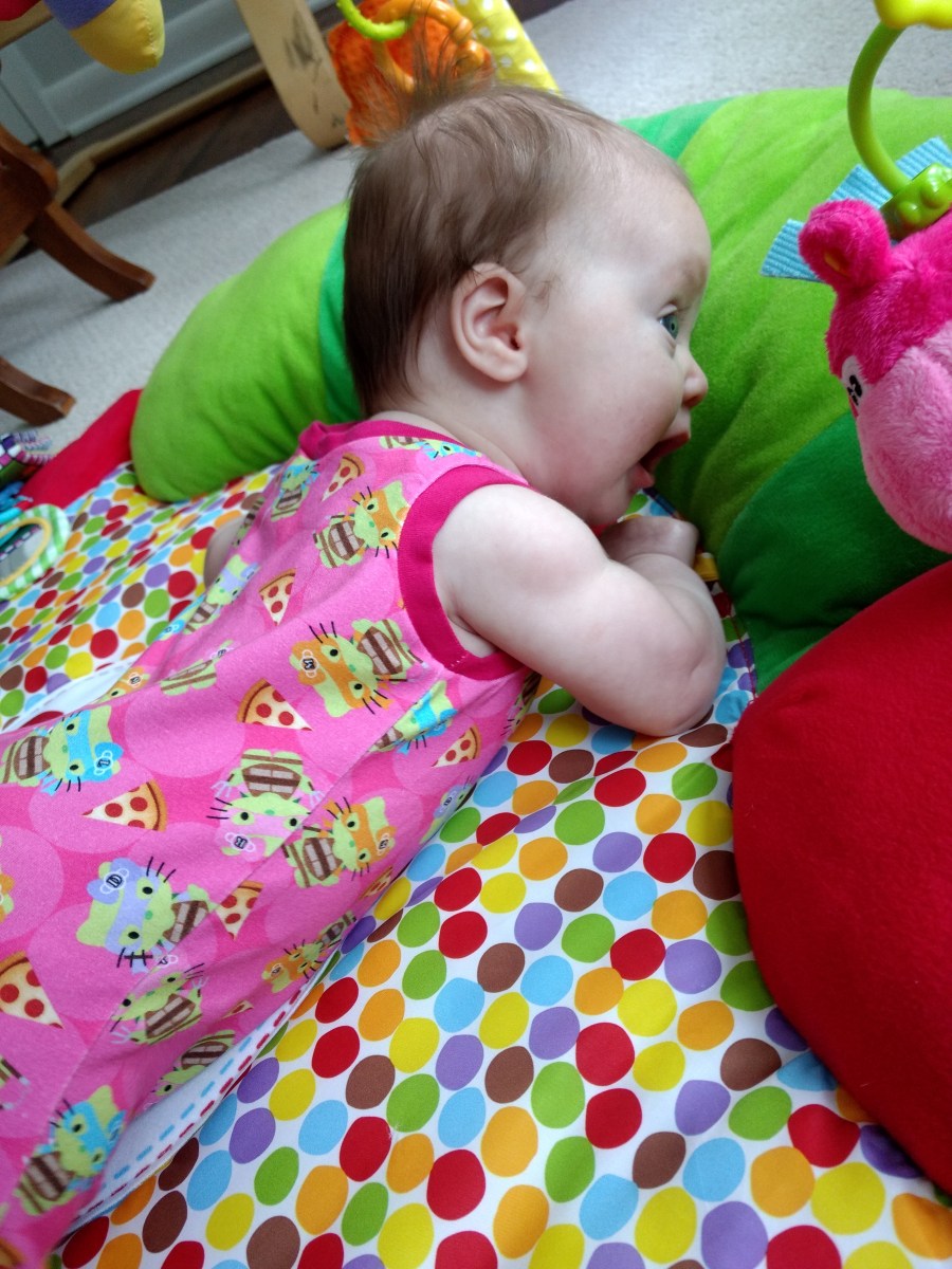 She’s working on Tummy Time at daycare and at home on the weekends and is rolling over to her tummy by choice lately.