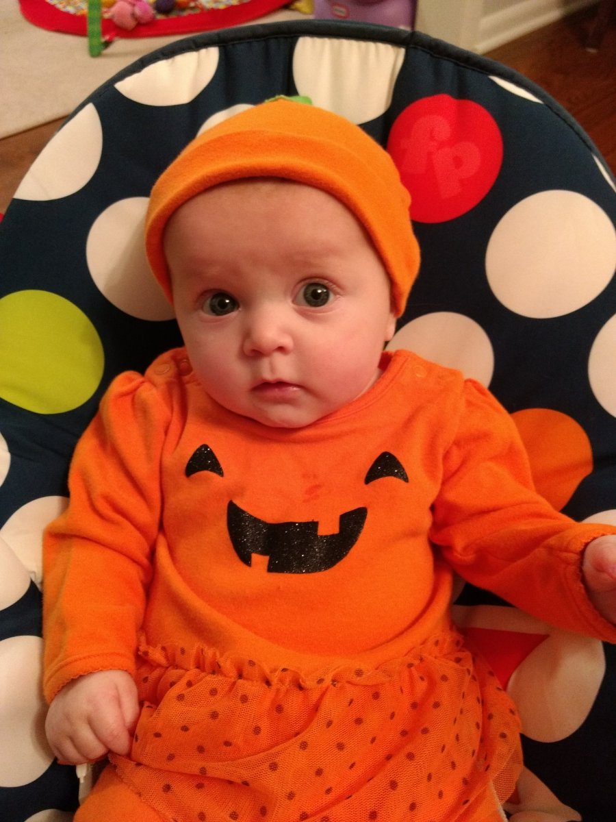 Ember has LOTS of clothes from LOTS of my friends. Part of that includes Halloween costumes. I’ll be honest, when I woke up Tuesday morning, it took me a few minutes to remember we were supposed to have a costume for school. I’m glad I remembered, though. As this tiny baby is rarely in the same outfit when I pick her up from school as when I drop.her off, I knew I would be packing her costume and sending her in PJs. But before I did, I just had to get a few photos.