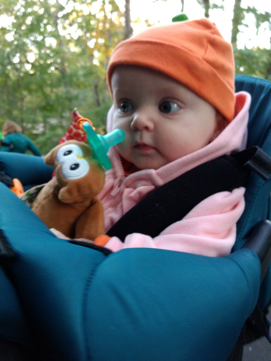 But by about half an hour, she was all tuckered out. We laughed at each house as we had Trillium get candy “for the baby” and then headed home to get the sleepy pumpkin to bed.