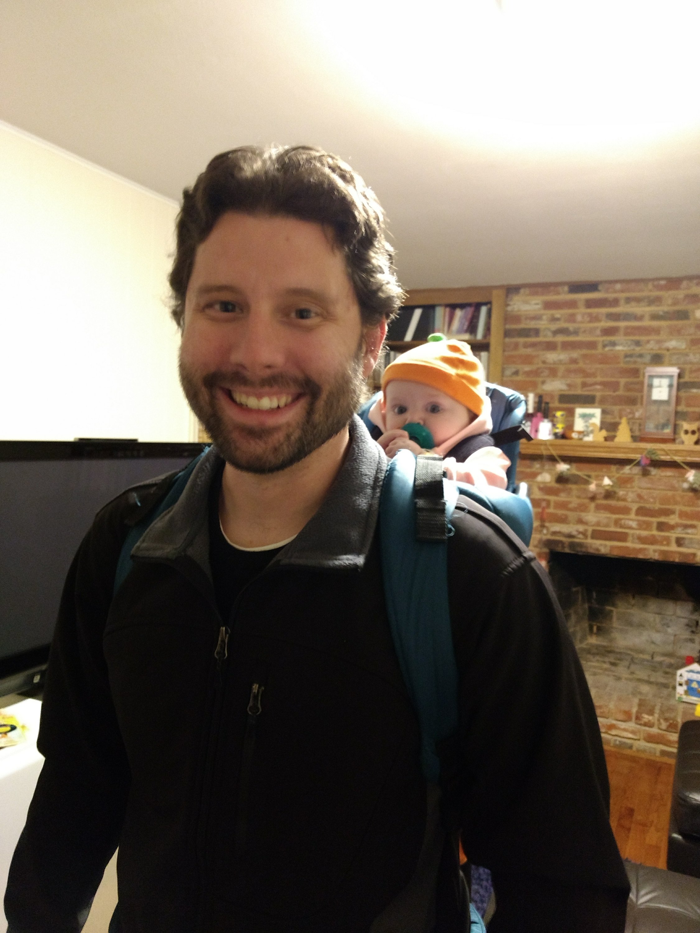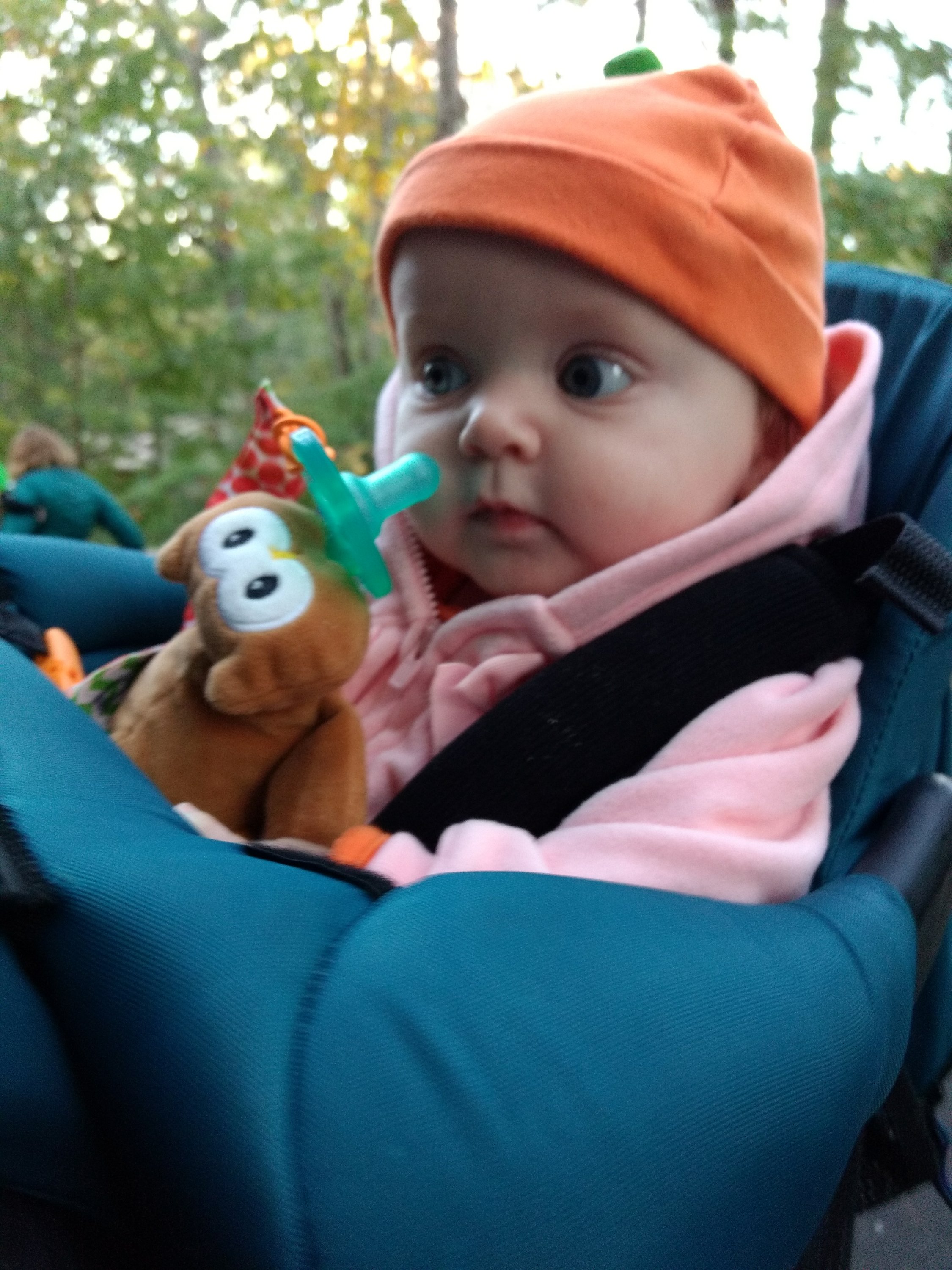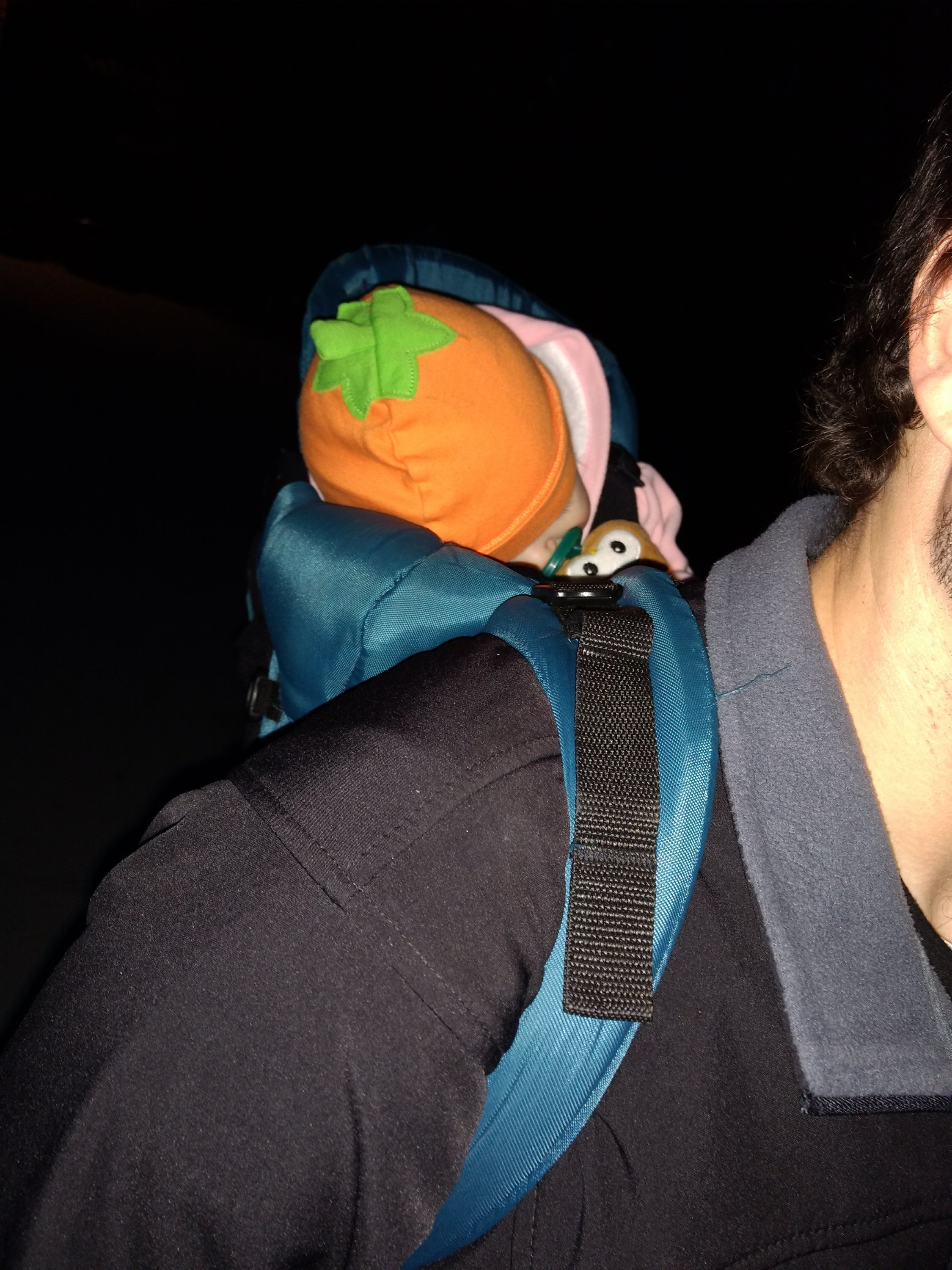So back we went to our original Pumpkin, but threw on a hoody since it was going to be cold. We figured the backpack was the best plan, so we went to our friends’ house and got all saddled up.