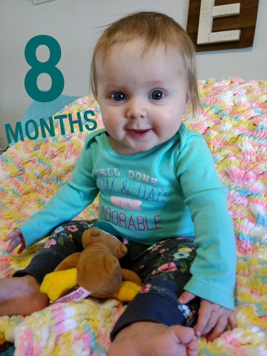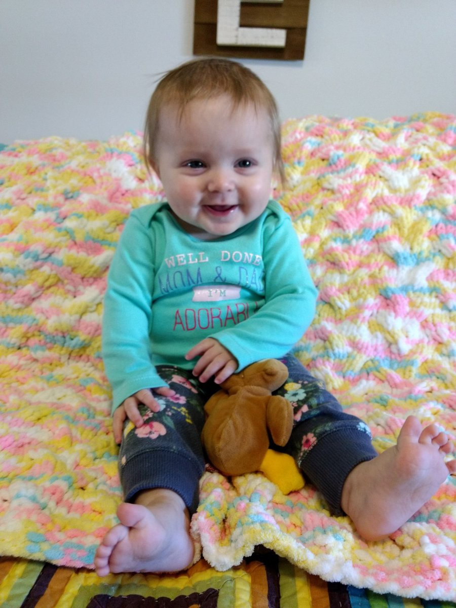 She loves sitting up and smacking things – toys and everything else. She is a happy little girl who spends most of her time bouncing around, blowing raspberries, and going “aaaaah!” like a tiny monster. Apparently at 6 months, babies should he saying “ma, ba, da,” but Ember just goes “aaaaahhh!” Which is fine by us. If she’s anything like her mom, she’ll have plenty of time to talk.