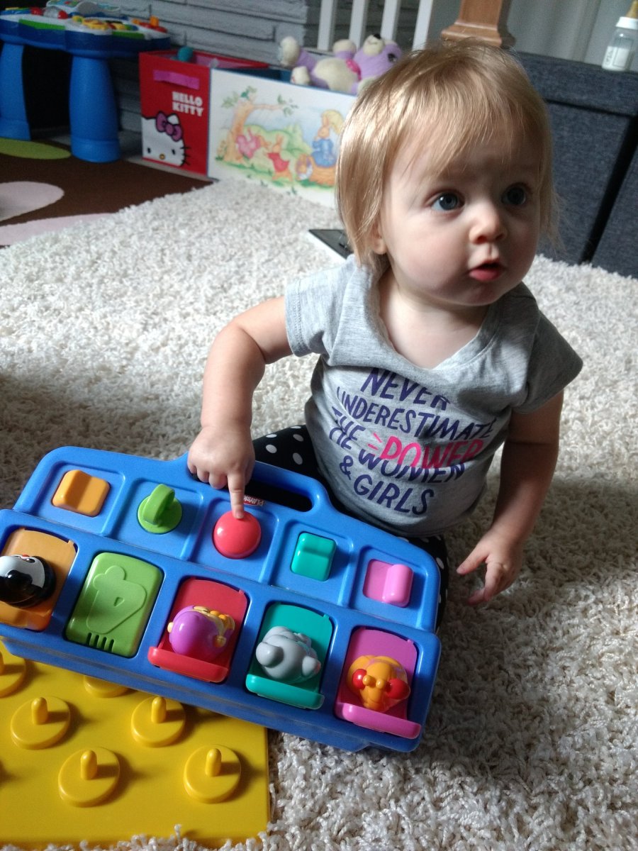 More than anything else, she loves BOOKS! She will open them, point to the words, turn the pages, and loudly read the story to you. She’s only just started to let me read with her – before that, when I’d reach for the book she would yank it away and close it. Obviously I was doing it wrong!
