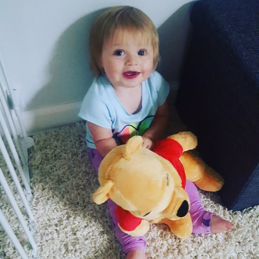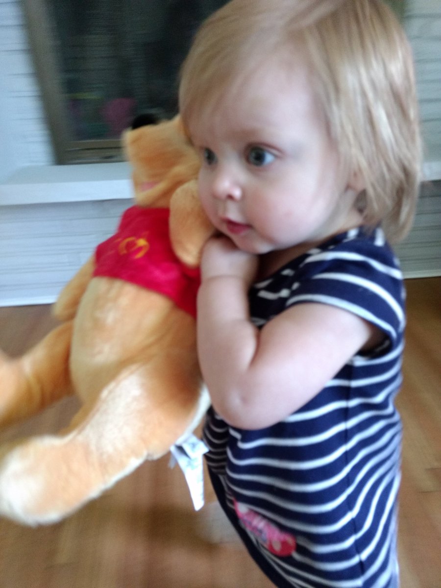 She loves Winnie the Pooh, which she found a strong love for at daycare. We decided it was time to get her one for home as well and she was over the moon. Pooh is also a word she knows.