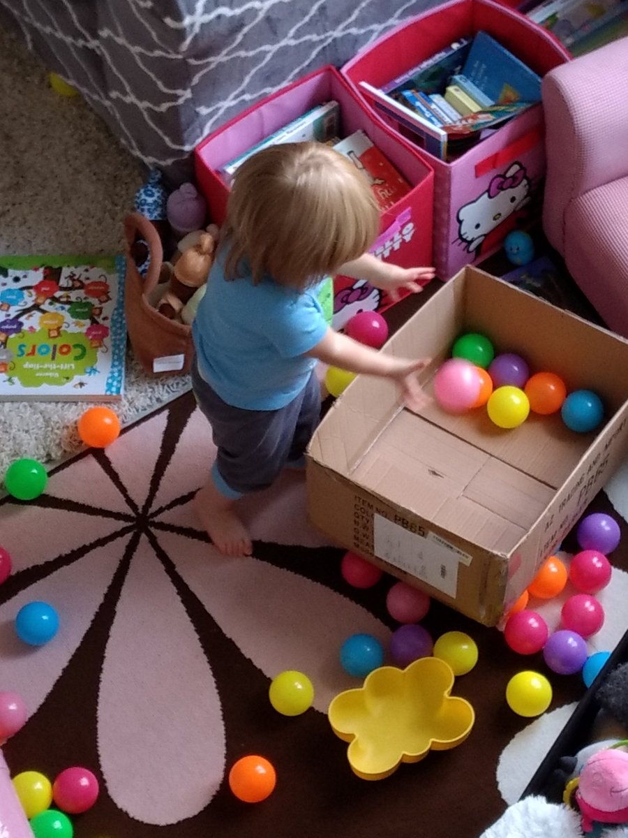 We recently got her some plastic balls thinking we might make a ball pit but have realized it’s much better to just put them in a box because she is a HUGE fan of dumping the whole box out and then filling it back up again.