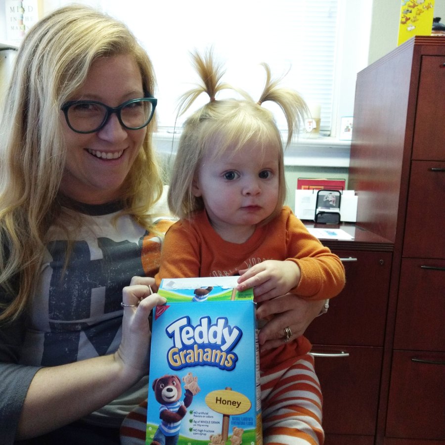 She LOVES coming downstairs to the Accounting and Marketing offices every day that mom picks her up because she gets to eat snacks with Aunt Angie. Who can blame her?