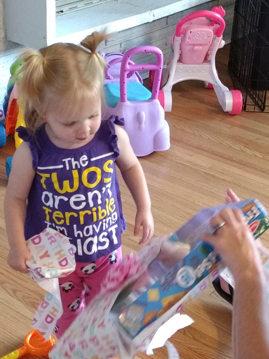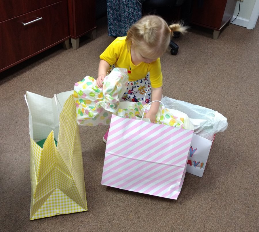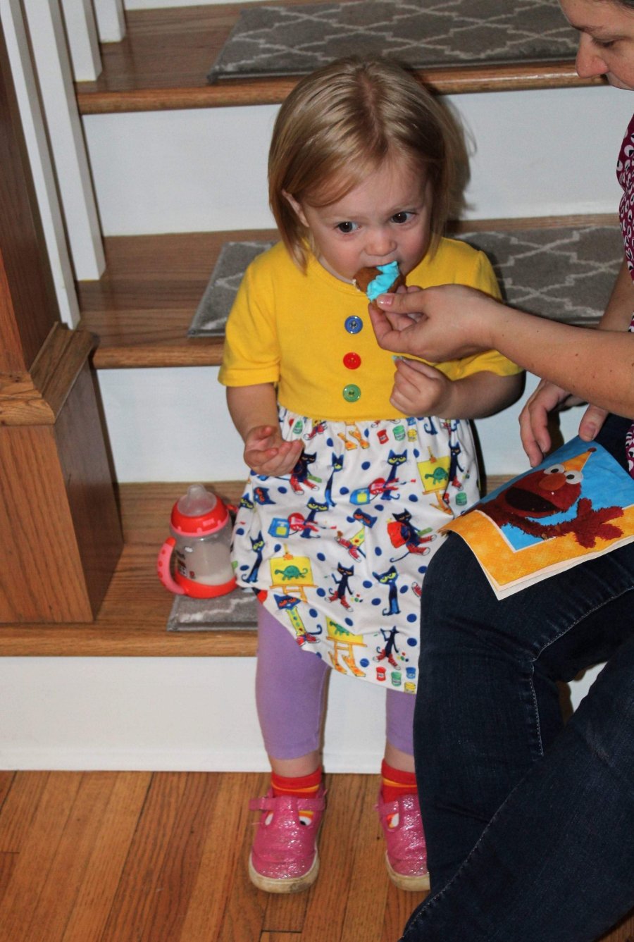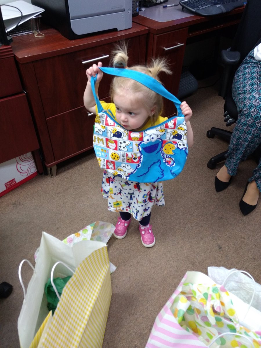 Friday at school she wore her Pete the Cat dress and opened gifts from my sweet office mates.