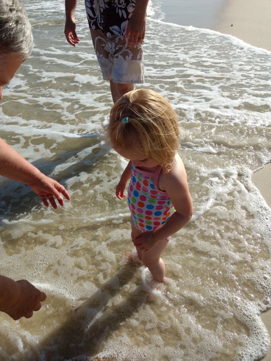 She enjoyed the beach little by little but loved the pool each day. She got more and more confident and by the end was happily blowing bubbles in the pool and kicking her feet behind her. She even walked in the ocean and played with some seaweed.