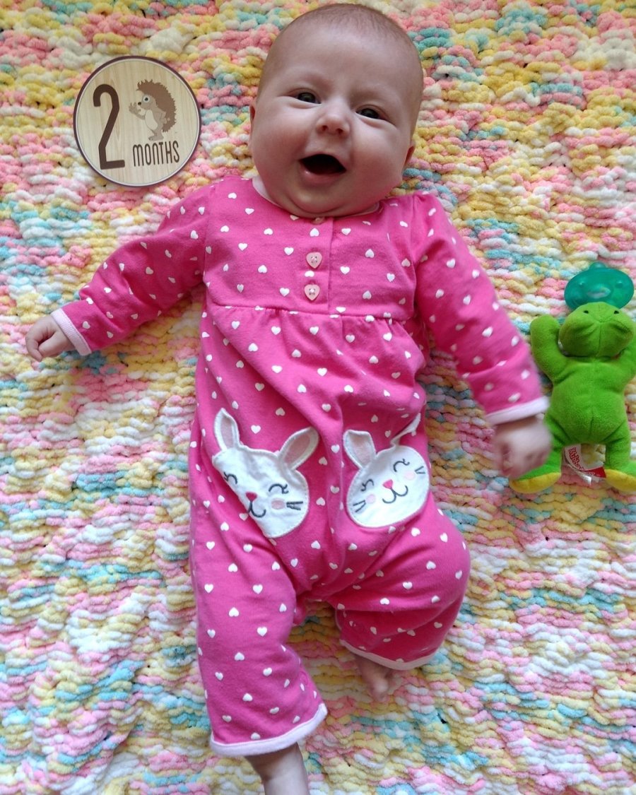 She’s gaining weight (11lbs 12oz!) and starting to coo and babble. She likes to lie on her back and kick her legs and wave her arms like she’s running a race.
