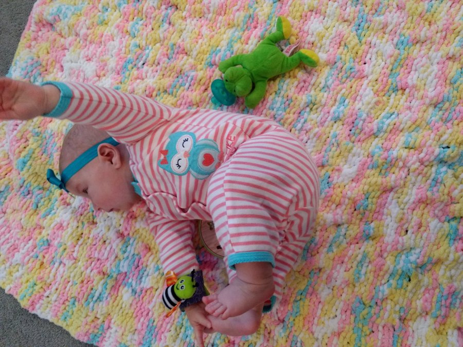 She has recently been very interested in everything – studying anything she can get her hands on, picking up her toys and checking out faces and lights and everything else she sees. She’s cooing and squeaking and trying to roll over anytime we let her play on her mat or the floor.