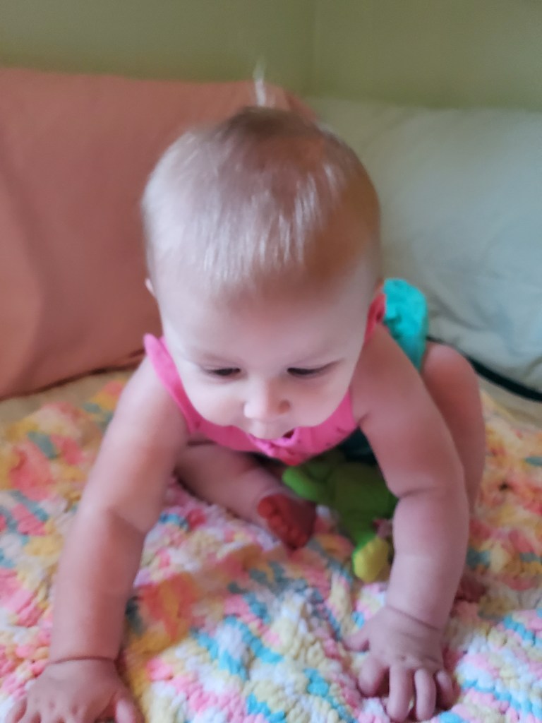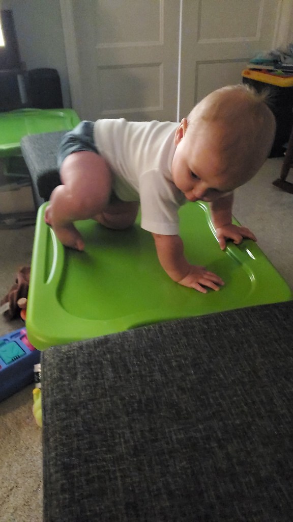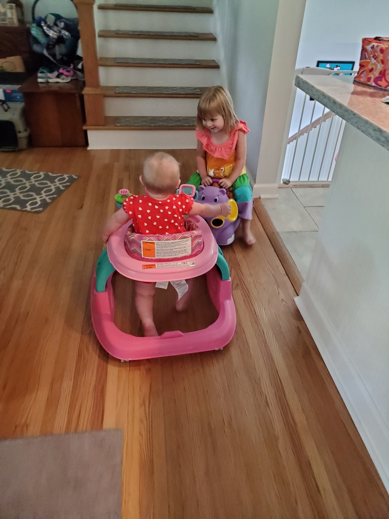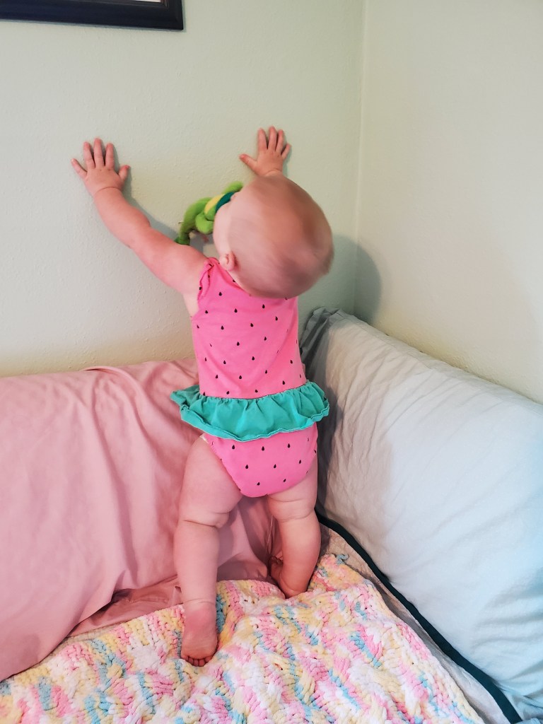 She loves to “creep” by climbing her way around on anything she can pull up with – including the wall. She crawls FAST anytime she’s let loose and LOVES to play with Ember in her “car” around the house.
