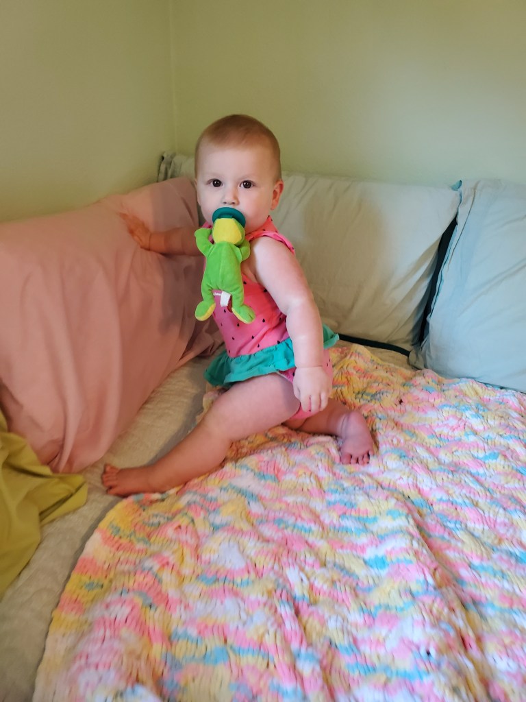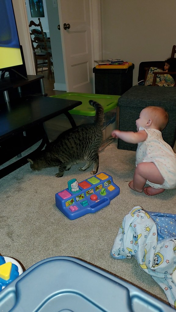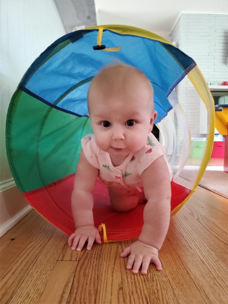 She’s almost learned to climb her way out of our most used barricade, which means we will be moving the playpen into the den soon so mommy can still work while the girls play.