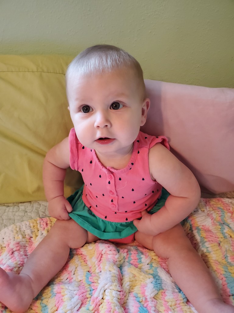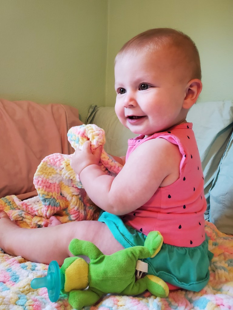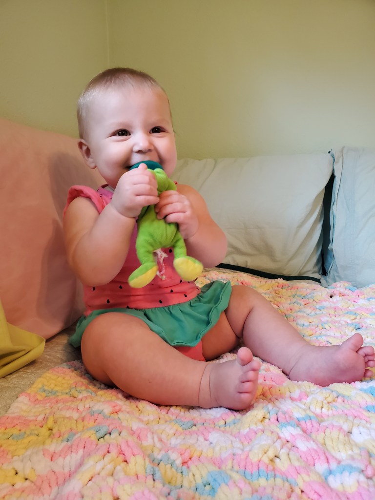 She loves playing with toys and her sister and HATES if mom walks out of the room – which makes for a lot of pitiful screaming when the girls are all home together all day everyday while mom works at home. She has 4 teeth and another one coming in fast.