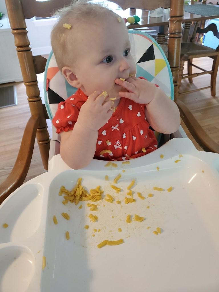 She loves to eat food and only loses 1/4 of each pouch she wolfs down. She loves crunchy snacks the best – veggie straws and crunchy cheese puffs are her current favorite.