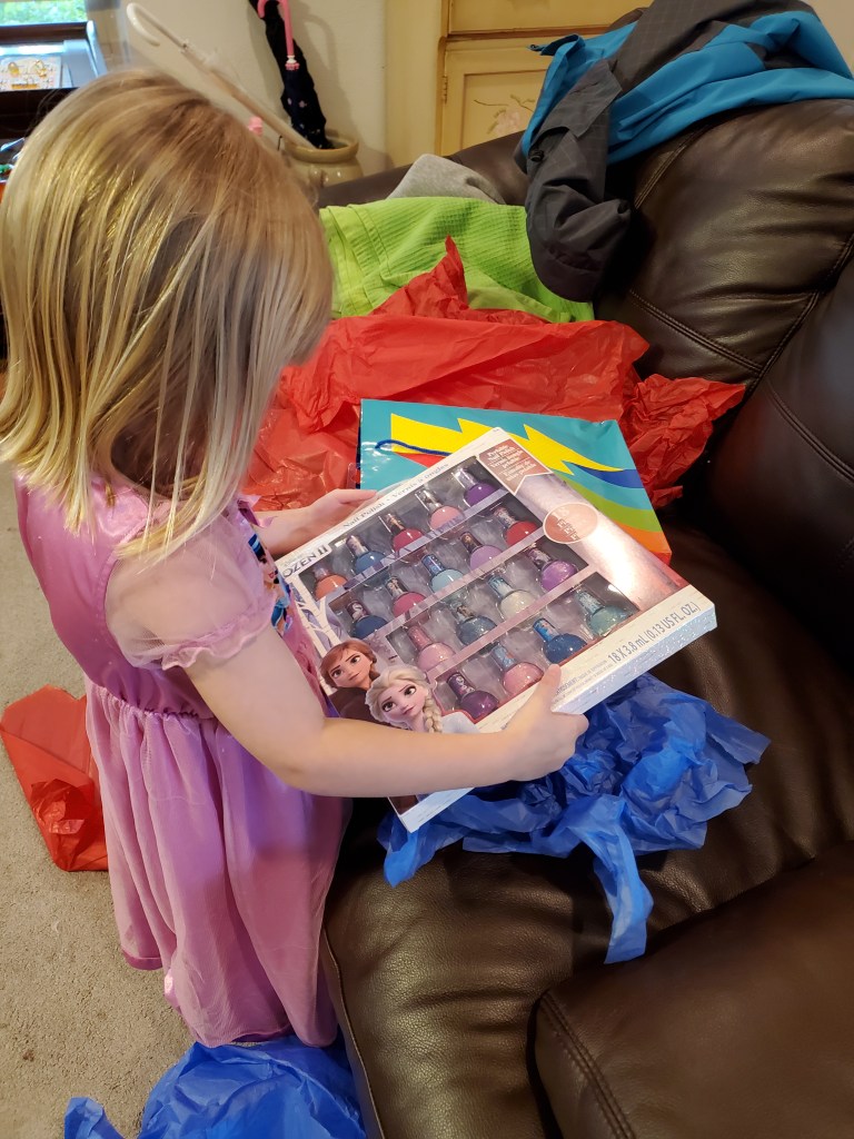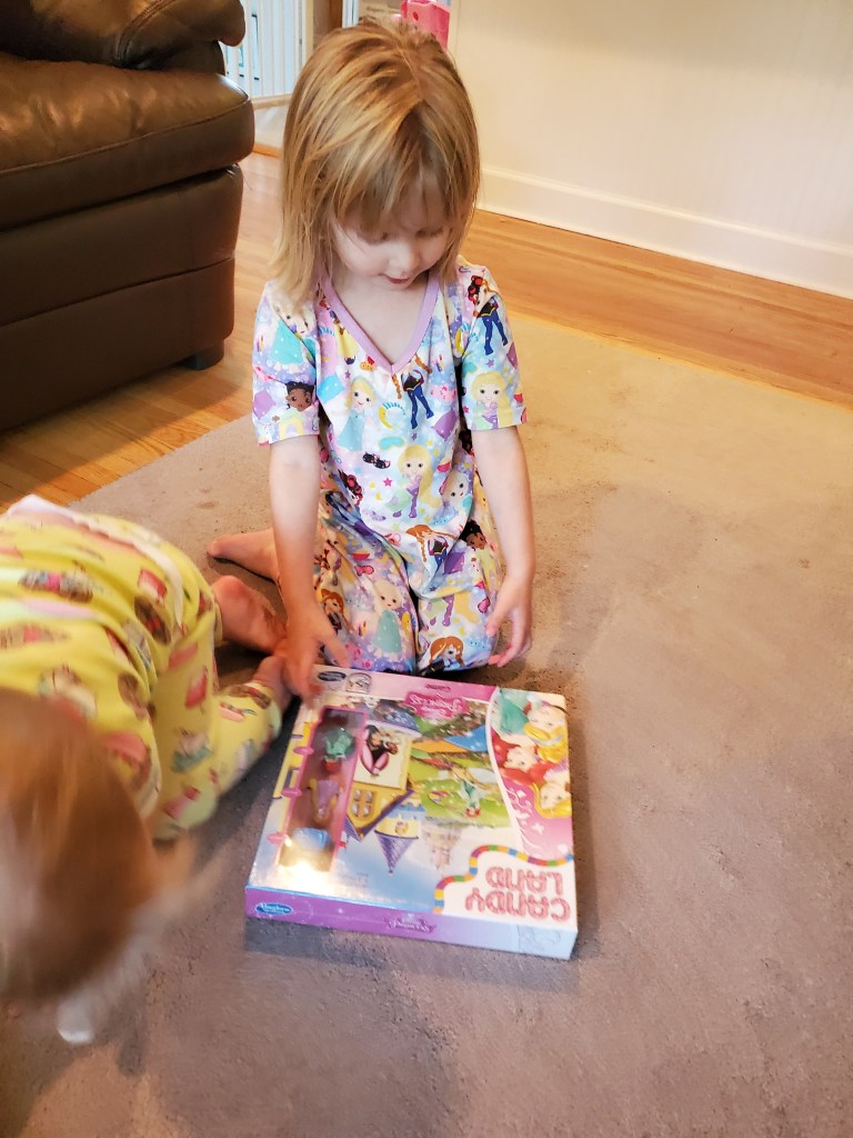 After getting all washed up and warmed up, Ember opened her gifts from Mommy and Daddy – big girl games all Princess themed including Candy Land!
